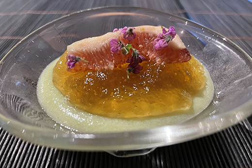 先付:甘唐と汲み湯葉の摺流し、干し椎茸だしの水晶掛け、いちじく、花穂