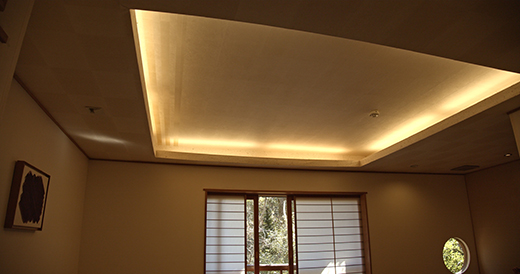 和紙の天井に組み入れた間接照明。和紙が光を柔らかく拡散させているのが分かる。照明を点けると、部屋全体が温かみのある雰囲気となり、天井に広がる光によって空間が広く感じられて開放感を覚えるのだ。気が付かないところにリラックスを与える演出がなされているわけだ。