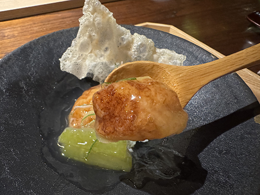 海老真薯に銀餡がかかった上品な逸品。海老の甘味がぎゅっと凝縮され、繊細で深みのある味わい。海老独特の香りと香ばしさが口の中に広がる。ふんわりとした真薯の舌触りが滑らか。