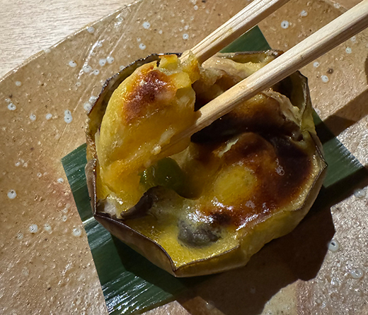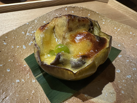 丸茄子と平茸の素味噌焼きは和風グラタンの様とも表現できる。山の幸として木の子も代表的な秋の味覚だろう。木の子はそれぞれに違う香りを持ち、その食感も様々。秋の味覚には木の子の個性を味わう料理も楽しみの一つだ。