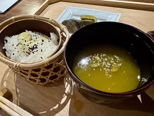 南瓜の擦り流し。和風ポタージュとも言える擦り流しは滋味深い。上質の出汁と素材の摺りつぶしで乳製品は使わないため、非常にシンプルで素材の味が引き立つ汁物。なめらかな口当たり。素材を活かす繊細な日本料理のひとつと言える。温かな摺流しは身体の中から温めてくれる。ほっとする味わい。
