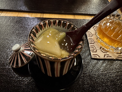蕪の深鰭餡掛けは温かい前菜。鶏がらだし仕立ての深みのある餡が、舌で潰せるくらいの柔らかい蕪に絡んで「じゅわっ」とした食感。