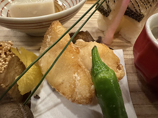 皮目の香ばしい金目鯛の焼き霜造り。しっとりとした身との調和が他の魚とは一味違う楽しみ方ができる気がする。 インバウンドが増えた近年は、地魚のお造りを希少な日本酒で楽しまれる欧米のお客様も増えたと聞く。