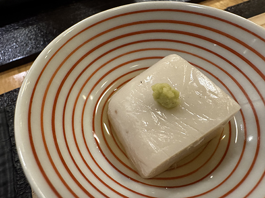 雲子を丁寧に裏ごしし、葛粉(くずこ)や寒天、だし汁などの調味料と混ぜ合わせて固めた雲子豆腐。寄せ豆腐(よせどうふ)や玉子豆腐のようなつるんとした食感が。クリーミーで濃厚な味わい。