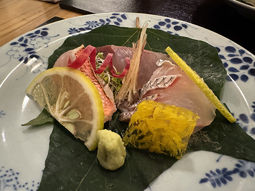 お造りは地魚3種。金目鯛の焼き霜造り、真鯛、カンパチ、菊の花ゼリーでいただく。