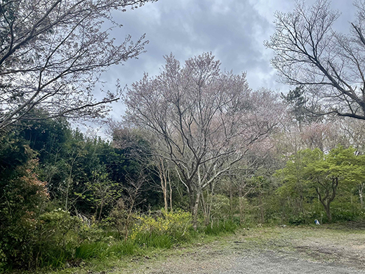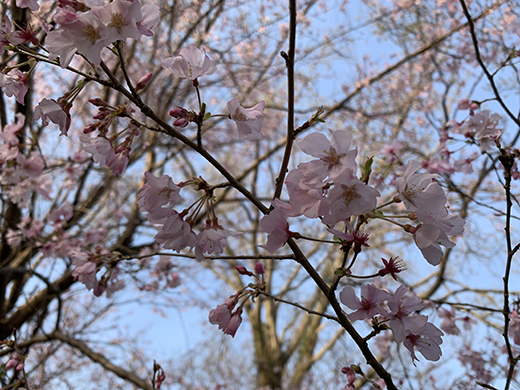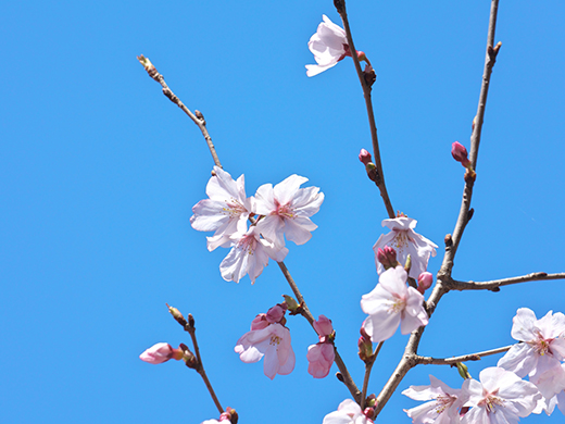 小彼岸桜は控えめな薄いピンク色。おかめ桜の鮮やかで濃いピンク色とは対照的。一重咲きで小さめの花で、しとやかに寄り添うように咲く。この慎ましさが、日本の伝統的な美意識に合致していて、ファンも多い。おかめ桜の少し後、時期が重なる頃に見頃を迎え、白や淡いピンク色の小ぶりな花を咲かせる。うさぎの森の散策路沿いに3月頭頃、満開となり見ごたえがある。