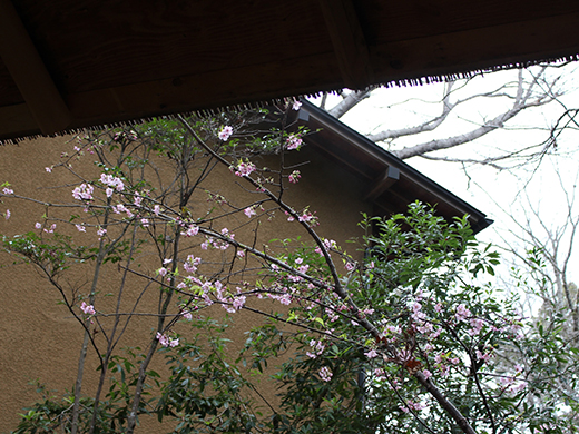 甘味処に入る月見門をくぐると、植え込み沿いの小径におかめ桜の色が映える、風情ある写真スポット。白翁棟と黒文字湯の間にもおかめ桜が咲く。派手さはないが和のテイストに調和して美しい。