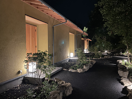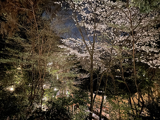 湯上がりの余韻として、そのままぶらりと「森の小径」へ。お風呂で温まった体で、夜桜のライトアップを眺めながらお部屋へ戻るルートもおすすめしたい。