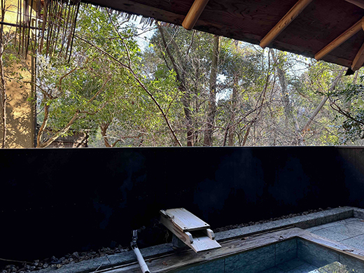 湯船に浸かると、目の高さに濃いピンク色の河津桜が広がる。1月・2月の肌寒い時期に、ひと足早い春を感じながら「お花見露天」ができる一番人気のスポット、ビューポイントだ。