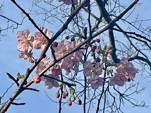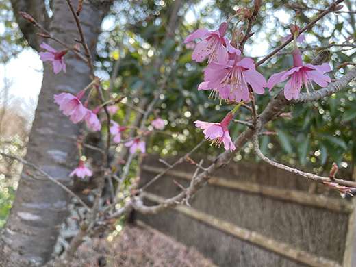 伊豆高原「花吹雪」5000坪の広大な森では、例年よりやや早いペースで開花が進みそう。玄関先の1月初旬に河津桜が咲き始め、早くも春の訪れを告げている。
