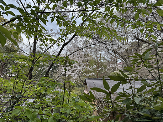 敷地内の桜名所を「花吹雪の桜マップ」を見ながら巡り楽しむことに。滞在時期や宿泊する部屋、敷地内の場所、また桜の種類によっても楽しめる。森を背景に、和の空間を通して桜も様々な表情がある。支配人に今年の開花予想を聞いてみた。